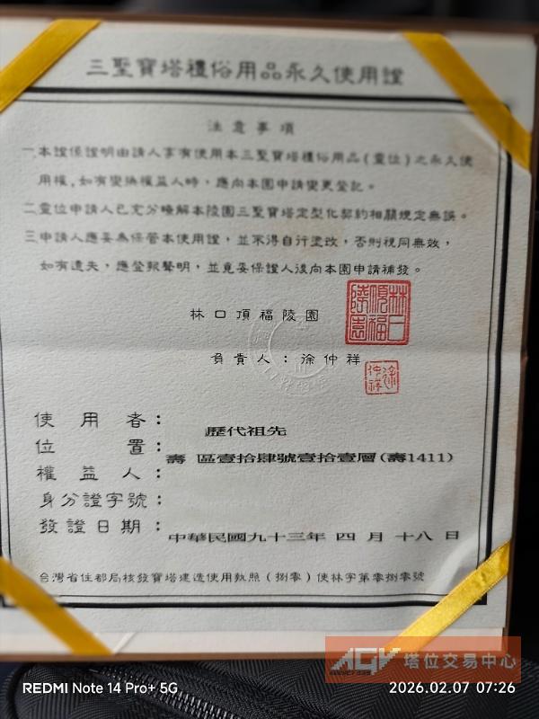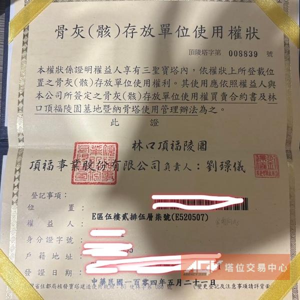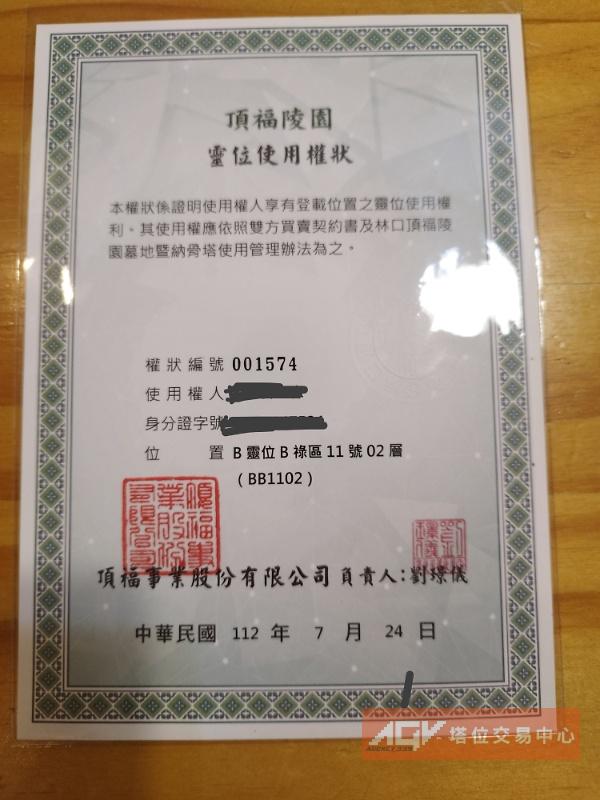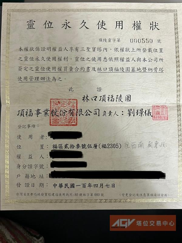 林口頂福陵園塔位 F區一樓六排二號二層 坐東北朝西南