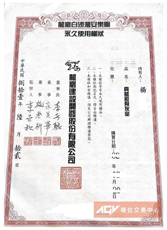 龍巖白沙灣安樂園 真龍殿骨灰室 (個人自售)